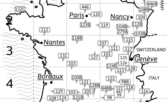 Unfortunately, we accidentally included the German edition map of France in the English directory on page 97. *sigh*. Find a jpg-file of the correct map here: https://eurotopia.de/images/2019France.jpg or use this pdf to print on A4 format paper: https://eurotopia.de/NachdruckFrankreich-Karte.pdf